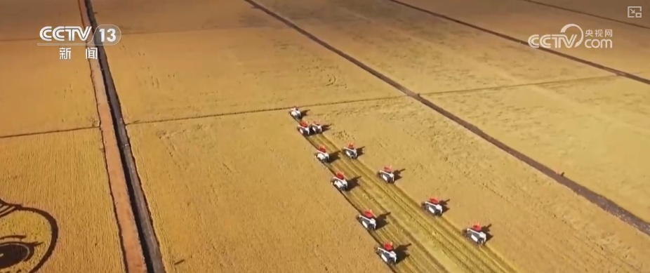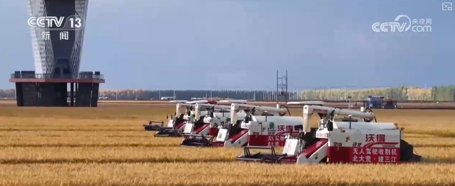 在黑龙江北大荒建三江七星农场,无人机跟随多台无人驾驶收割机记录正在进行中的秋收大会战。在五常大米核心生产基地,穿越机飞跃广袤田野,稻穗编织成的“黄金毯”一览无余。稻谷被整齐划一地“吞”入农机“口中”,开启这个丰收季沉甸甸的收获。