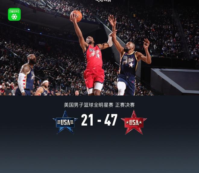 北京时间2月16日美国男子篮球全明星赛 正赛决赛,美国星条队对阵美国星辰队。开场美国星辰队迅速取得12-1开局,随着将分差拉大至20分以上,星条队无力反扑,最终美国星辰队47-21大胜星条队夺得全明星正赛冠军,爱德华兹荣获MVP。