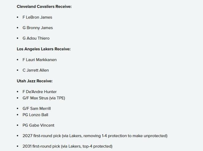 爵士得到:亨特、斯特鲁斯、梅里尔、鲍尔、文森特、湖人2027年首轮签、湖人2031年首轮签