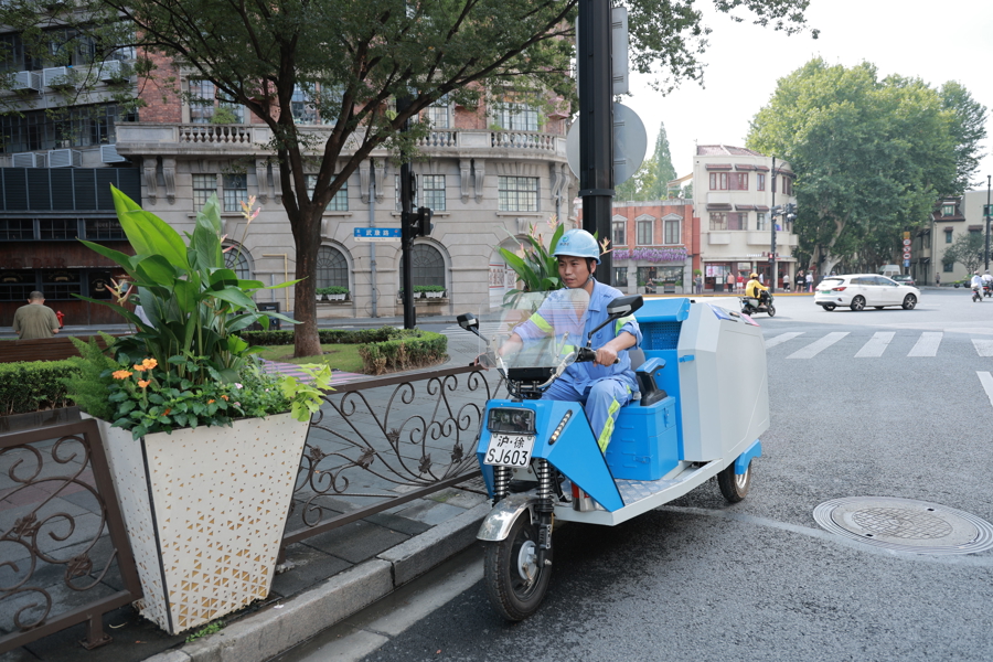 衡复风貌区的环卫面临两重压力:第一重是周边存在大量不设垃圾库房的老小区,尽管环卫采取了定时定点上门收取等方式方便居民扔垃圾,仍有一些居民会随手将垃圾扔在小区外面的绿化带里或行道树下,这种“漂浮垃圾”的数量不在少数;第二重是游客数量众多,他们在风貌区CityWalk,往往有一边走一边吃一边扔的需求,但环卫公司显然不可能在马路上设置大量固定式的垃圾桶,以免破坏城市风貌。