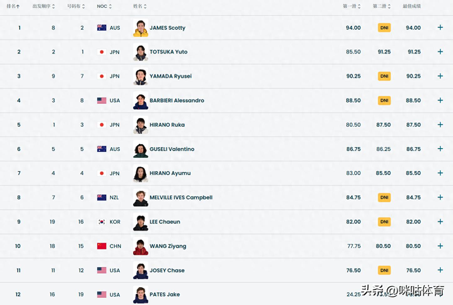 中国选手王梓阳,因其鲜明的个人风格被粉丝亲切称为“小黑”,他在预赛中展现出极强的稳定性,全程发挥稳健,未出现重大失误。首轮滑行中,王梓阳流畅完成整套动作,凭借均衡的腾空高度与动作完成质量,获得77.75分,为后续比拼奠定坚实基础。经过短暂调整,他在第二轮滑行中进一步发力,动作难度与完成度均有提升,成功拿到80.5分的高分。最终,王梓阳以80.5分的最佳成绩,排名预赛第十位,顺利晋级决赛,向着更好成绩稳步迈进。