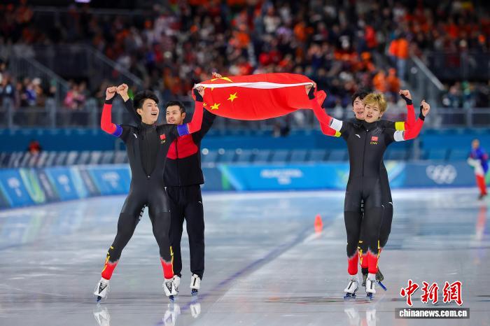 当地时间2月17日,2026年米兰-科尔蒂纳冬奥会速度滑冰男子团体追逐B组决赛在意大利米兰举行。由刘瀚彬、吴宇、李文淏、宁忠岩组成的中国队以3分41秒38的成绩战胜荷兰队,获得铜牌。图为中国队在比赛后庆祝。 中新社记者 骆云飞 摄