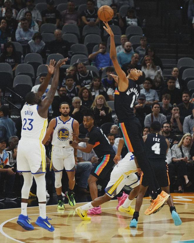 比如,文班今晚三分线外前4投全丢,仅在第5次出手才命中一球。但末节关键时刻第6次在外线出手时,他面对的依然是两人包夹。