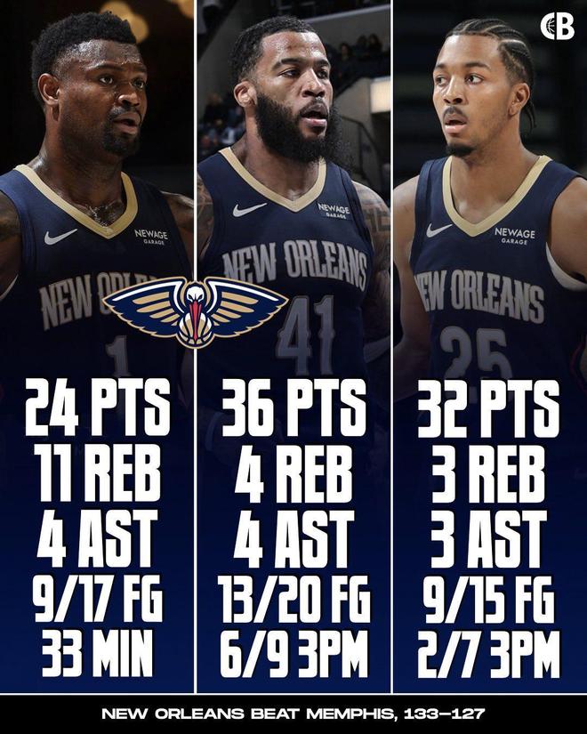 此役鹈鹕击败灰熊的三个功臣,分别是:锡安-威廉森、特雷-墨菲、萨迪克-贝,胖虎全场比赛33分钟,拿到24分11篮板4助攻(末节7分3篮板1助攻2抢断);