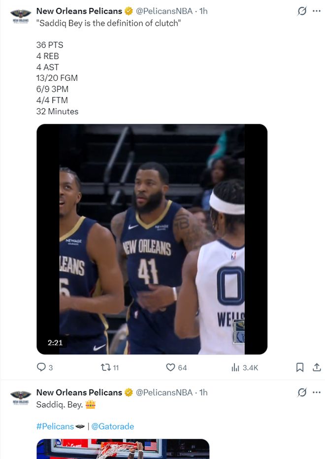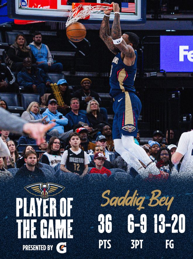 这场比赛萨迪克-贝打出了鹈鹕生涯最高光的一场比赛,32分钟,20中13,三分9中6,罚球4中4,拿到36分4篮板4助攻1抢断0失误,命中率65%,三分命中率66.7%,真实命中率82.7%,正负值+5。