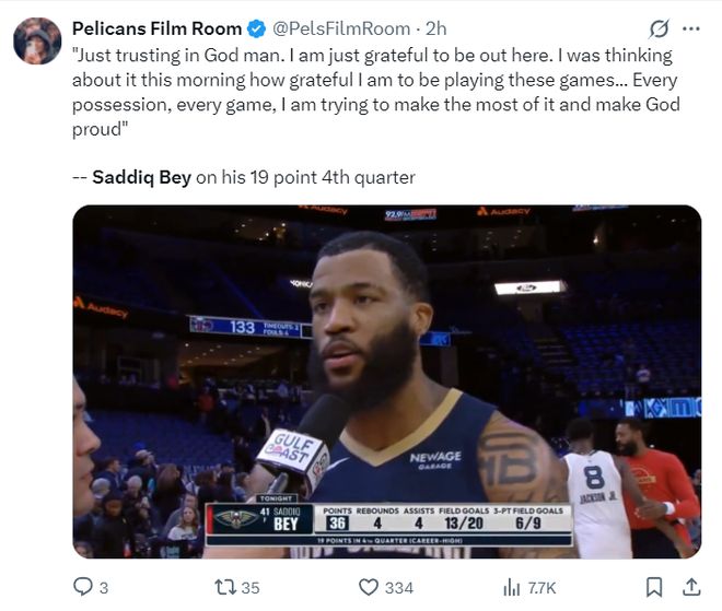 萨迪克-贝这36分是鹈鹕生涯新高,6个三分球也是鹈鹕生涯新高,末节19分也是鹈鹕生涯新高。