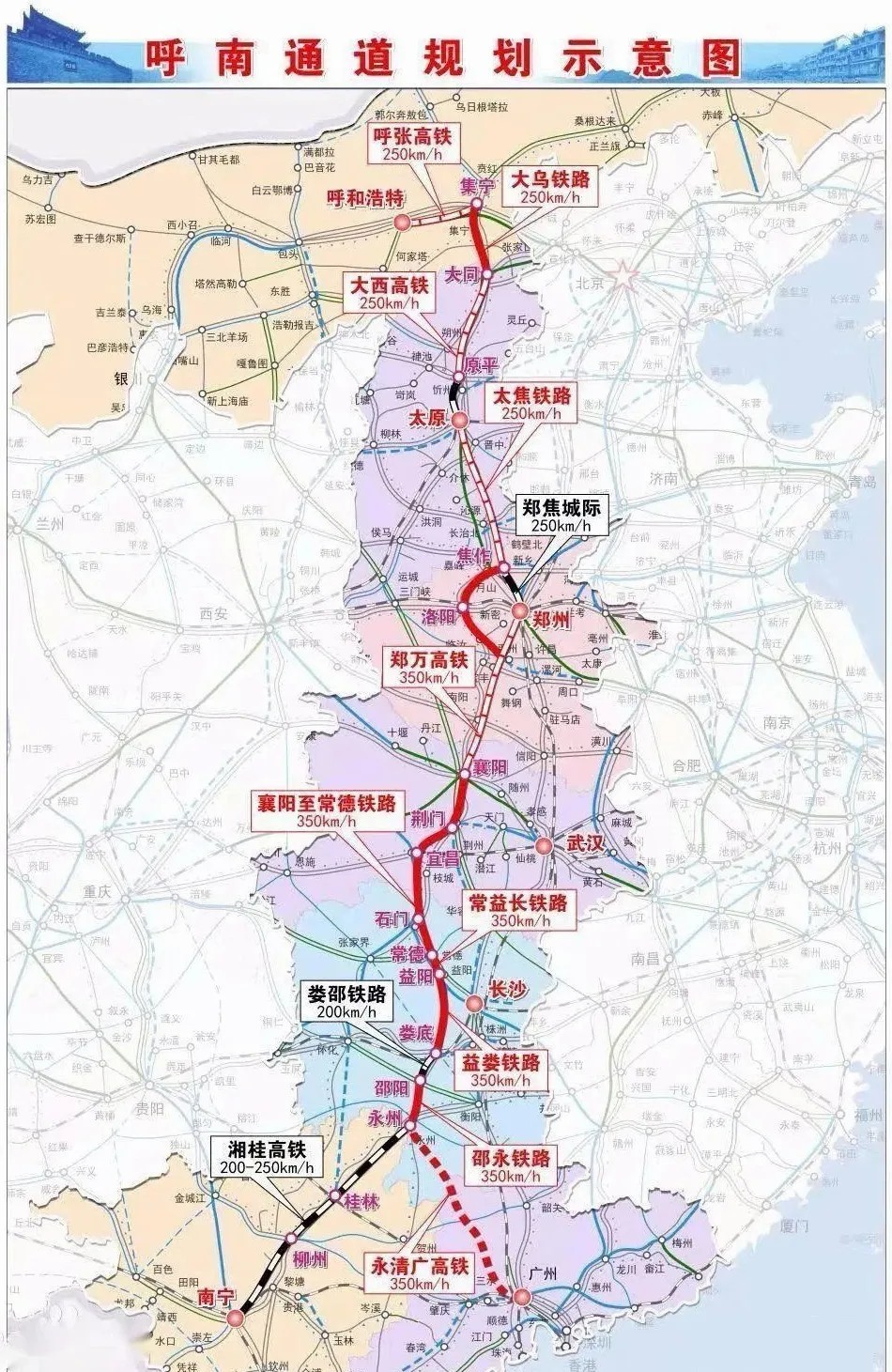 根据《中长期铁路网规划》,呼南通道具体走向为:呼和浩特-大同-太原-郑州-襄阳-常德-益阳-邵阳-永州-桂林-南宁高速铁路。