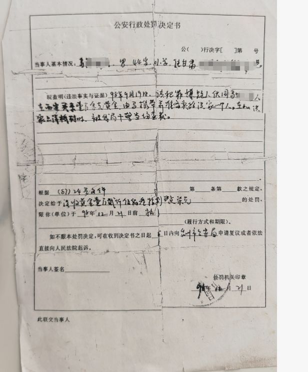 马先生说,当时确实有个人不允许倒买倒卖黄金的规定,但那时很多银行在向个人收购黄金,不同地区的收购价格存在差异。他父亲就从甘肃收了一批黄金来到浙江,在当地一位商人介绍下去台州销售,结果在大巴车上被当地警方查获。警方向他父亲出具了《公安行政处罚决定书》,将黄金没收,并以涉嫌非法经营罪将其父亲拘留。