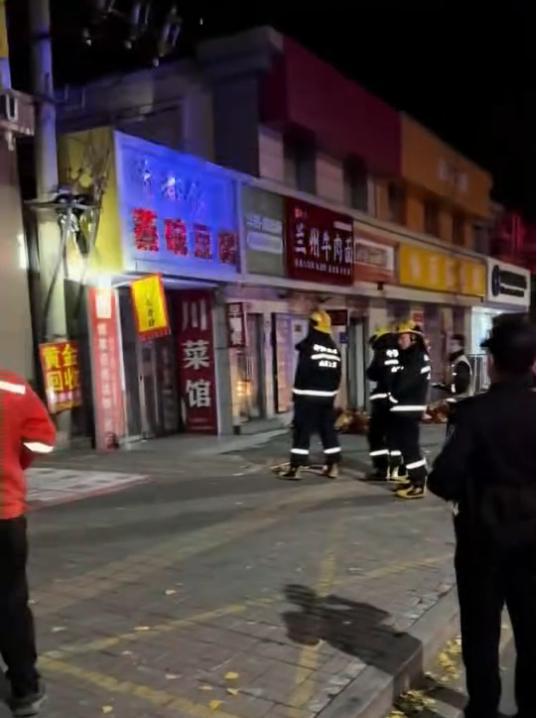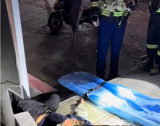 画面显示,街边停有警车,有民警和消防员赶到,现场疑似停电,有救援人员使用照明设备,灯光照射下,看不出男子有无活动迹象。