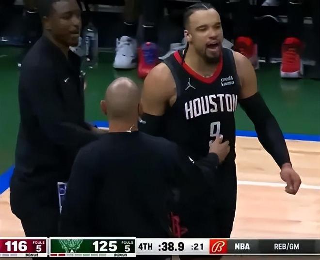 在对阵雄鹿的比赛中,狄龙因为不满裁判判罚与其理论时,火箭主帅乌度卡冲入场内为狄龙维权。