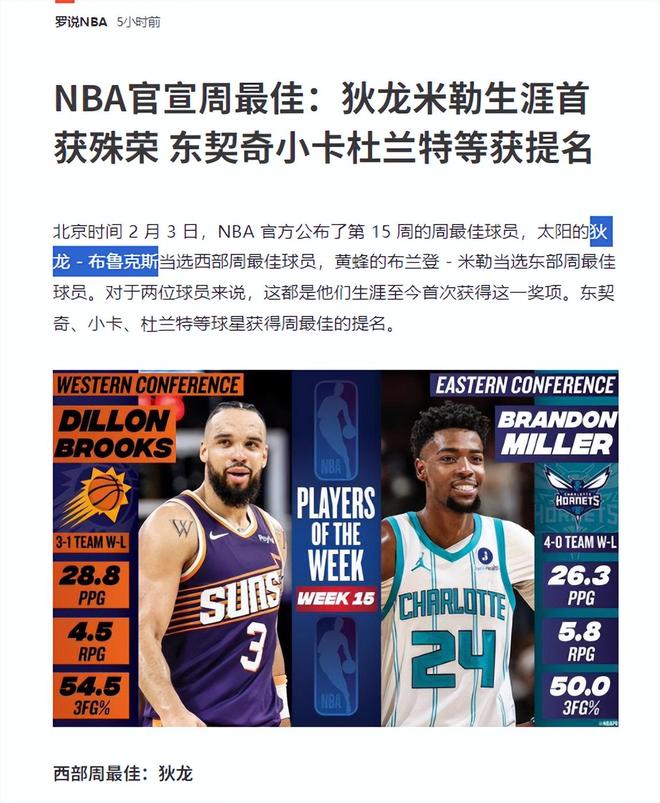 太阳队的狄龙成功当选西部的周最佳球员,而东部的最佳球员则被黄蜂的米勒收入囊中。