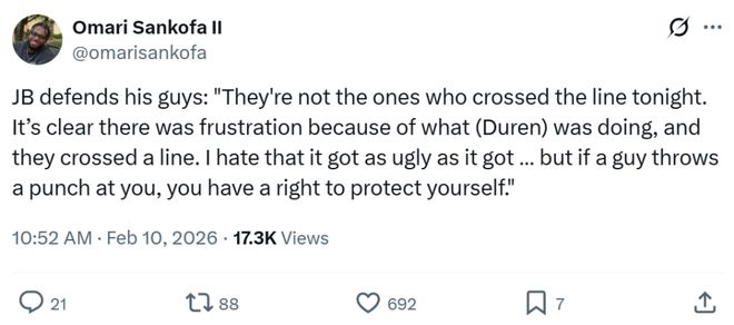 活塞主帅比克斯塔夫赛后表示:“很显然,越界的不是我们,是他们先因为杜伦的表现而感到沮丧,然后跨过了红线,才让事情发展的如此难堪,我讨厌这样,但如果有人向你挥拳,你当然有权自卫。”
