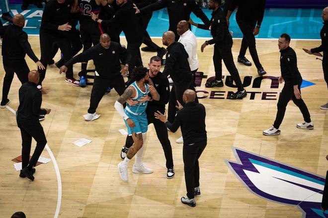 结果短暂分开后,原本应拉架的黄蜂球员布里奇斯又冲了上去,挥拳击打杜伦胸口,后者也直接挥拳反击,这引爆了第二波冲突。