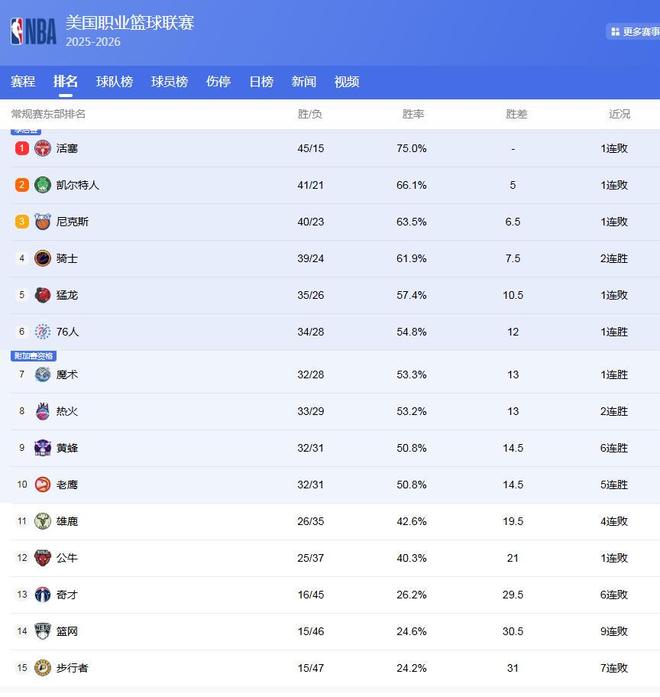 东部队伍中,活塞队一枝独秀,取得了45胜15负的战绩,领先第2的绿军5场,基本上锁定了东部第1的位置,而后面的绿军、尼克斯、骑士队,展开了第2的争夺!