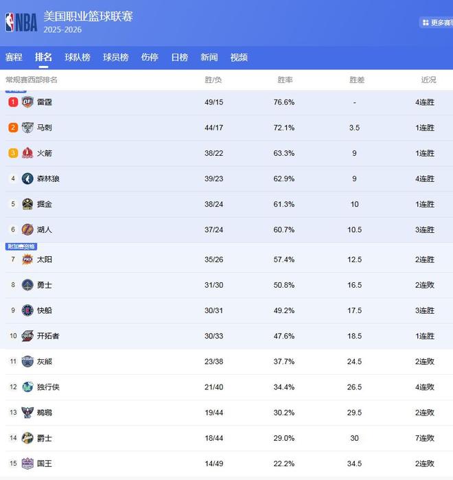 差距仅1.5场,4队抢西部第3!