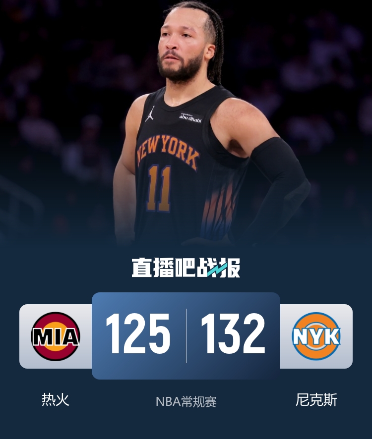 比赛开始,热火连中三分开局,随后热火外线多点开花连续发炮轰出10-0建立主动权,布伦森里突外投单节14分苦苦支撑,首节热火7记三分领先7分,次节布里奇斯下起三分雨,连中4记三分追上比分,布伦森继续火热状态再轰压哨三分,尼克斯半场反超4分。下半场,阿努诺比攻防回暖,但鲍威尔也里突外投几乎弹无虚发单节砍下19分回应,三节尼克斯还领先6分,末节双方展开拉锯战,韦尔里突外投还在努力追分且一度追到差2分,但布里奇斯三分还能止血,最终尼克斯132-125力克热火。