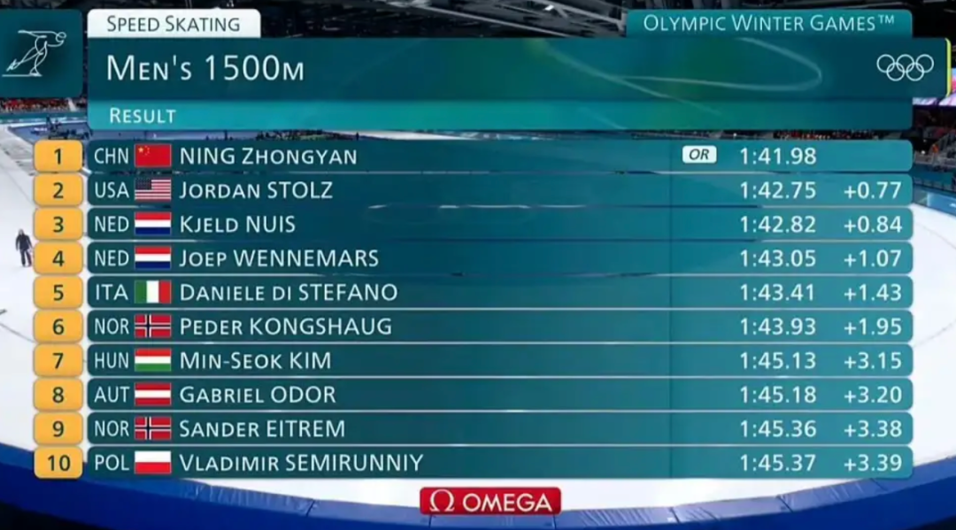 面对强敌环伺,宁忠岩没有丝毫杂念。他从内道出发,在起跑阶段就全力提速,并在后半程超越对手,最终滑出1分41秒98的佳绩,还把荷兰选手乔普·温内马斯刚刚创造的奥运纪录牢牢压在身后。超越奥运纪录1秒以上的成绩也把巨大的压力留给了随后登场的斯托尔兹。