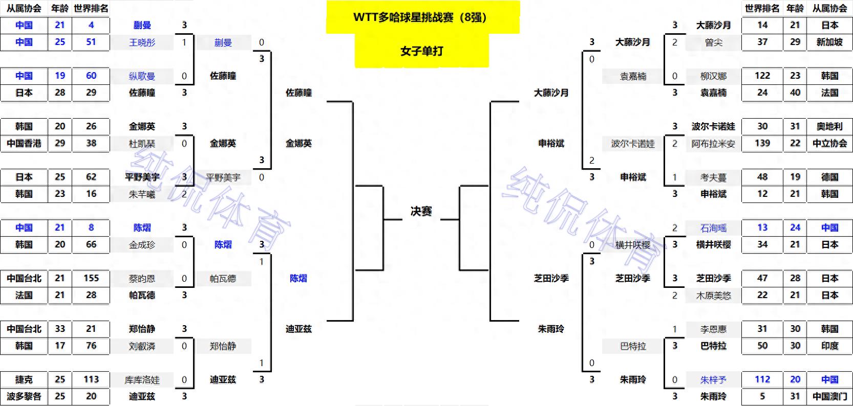 北京时间1月17日,2026年WTT多哈球星挑战赛进入第5个比赛日的争夺,目前女单八强正式出炉(详情如下图所示)!国乒女单参赛10人仅剩陈熠独苗;日乒女单参赛7人有3人晋级;韩国女单参赛9人有7人出局,下面带来详细信息。