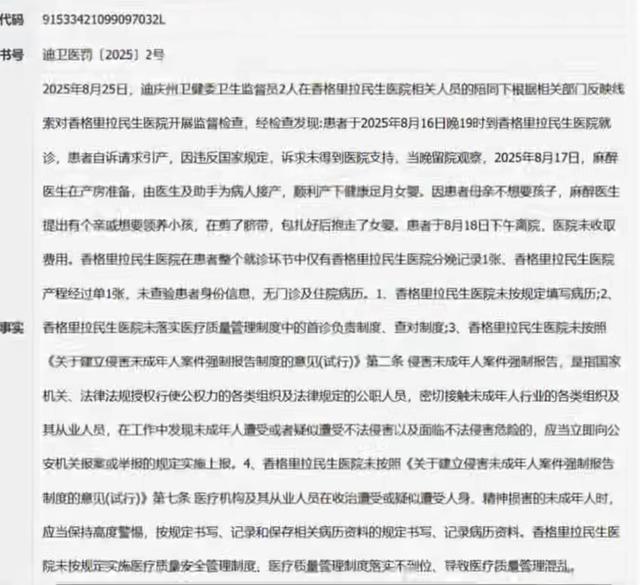 违法事实显示,2025年8月25日,迪庆州卫健委卫生监督员2人在香格里拉民生医院相关人员的陪同下,根据相关部门反映线索对香格里拉民生医院开展监督检查。发现一患者于2025年8月16日晚7时,到该医院就诊,自诉请求引产,因违反国家规定,诉求未得到医院支持。当晚留院观察,8月17日,麻醉医生在产房准备,由医生及助手为病人接产,顺利产下健康足月女婴。因患者母亲不想要孩子,麻醉医生提出有个亲戚想要领养小孩,在剪了脐带、包扎好后抱走了女婴。患者于8月18日下午离院,医院未收取费用。