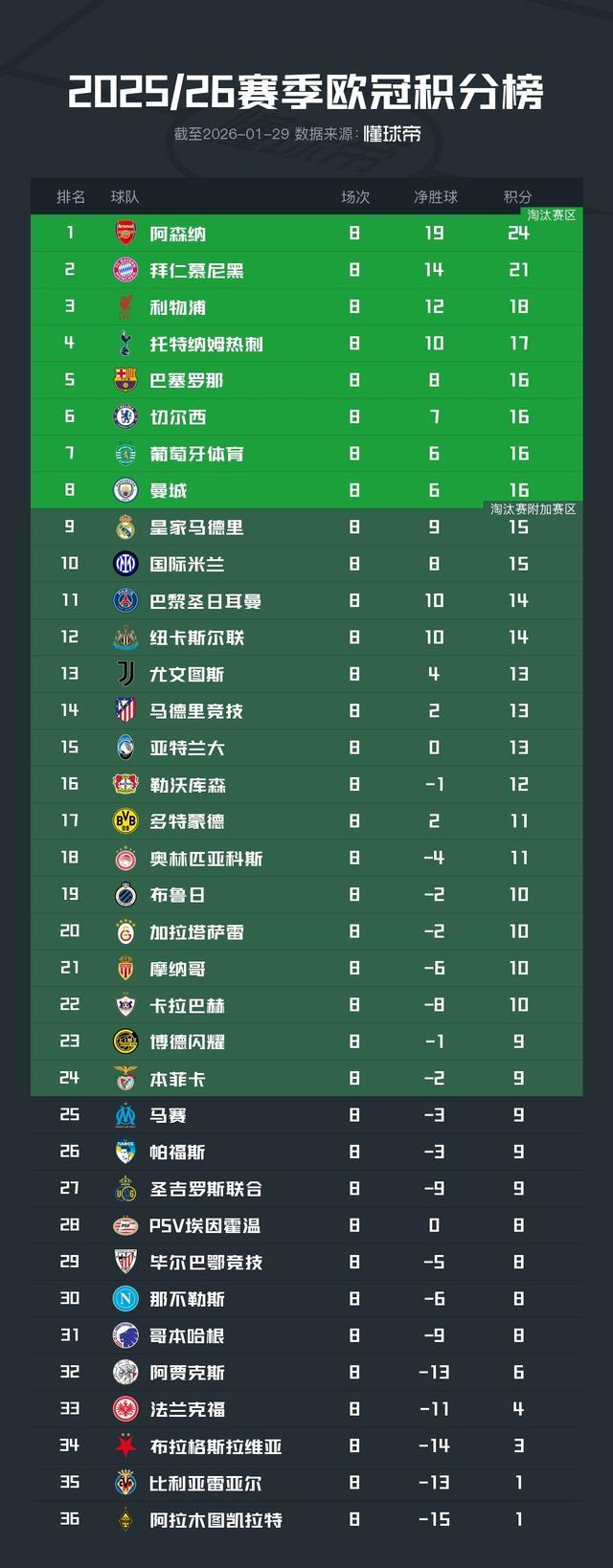 北京时间1月29日凌晨,2025/26赛季欧冠结束了联赛阶段的全部比赛,最终的晋级形势全部得到确认。