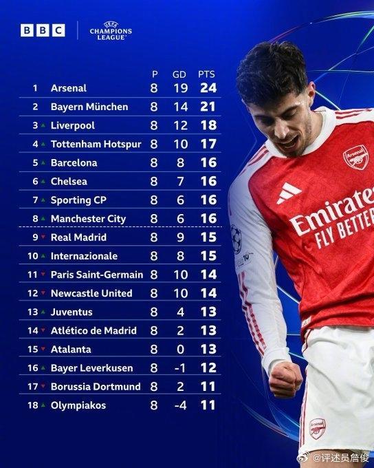 “六支参赛的英超球队中五队跻身前八名直接获得16强资格。反差最大的是热刺,英超排名14位欧冠第四!曼城有点惊险,但哈兰德破荒;阿森纳8战全胜保持完美记录,传射建功的哈弗茨是最大收获;切尔西险些为少帅罗西尼尔的后防怪阵付出代价,所幸若昂-佩德罗双响救主,替补上阵的帕尔默也送上两个助攻,那不勒斯被淘汰;利物浦迎来本季最大比分胜利,维尔茨的状态持续上升萨拉赫终于重新品尝到进球滋味,可惜随着弗林蓬伤退,目前阵中后防线只有三名主力没受伤;纽卡的巴恩斯错失绝杀机会,他们客场战平大巴黎,二月份将踢两场16强附加赛。