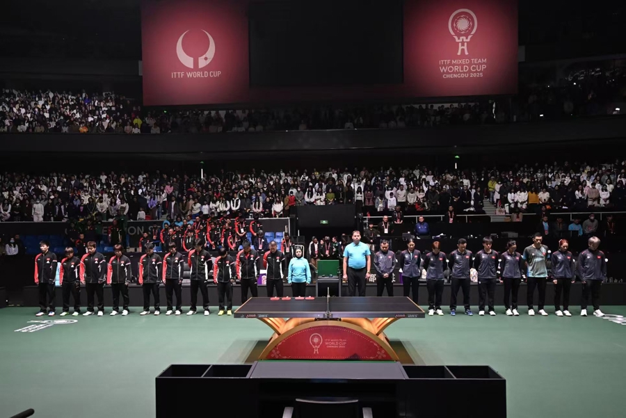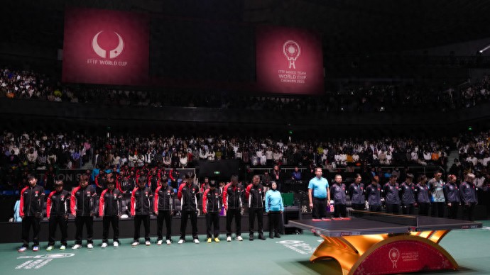 2025年国际乒联混合团体世界杯开幕仪式结束后,国乒与中国香港队的揭幕战开赛前,现场的灯光暗了,嘈杂的声音小了。在揭幕战球员入场后,现场主持人邀请全场起立,为中国香港大埔宏福苑火灾罹难者默哀一分钟。