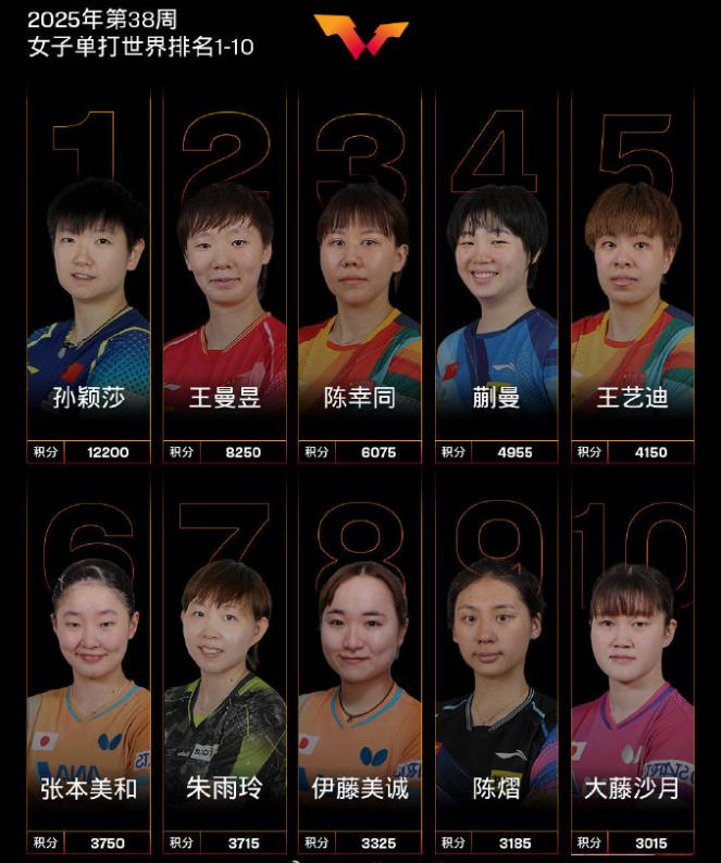 女单方面前五不变,分别是孙颖莎、、王曼昱、陈幸同、蒯曼、王艺迪,积分来看,孙颖莎依然也是断层12200积分,王曼昱跟第三的陈幸同也有一定的差距,所以位置也是很稳固。