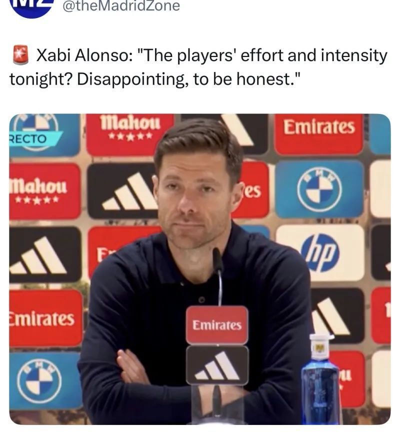 对于球队今天被爆冷,阿隆索很是不满。发布会上,他先是批评了球员:“球员们今晚的努力和强度?说实话,我有点失望。”在比赛中,他也曾当面指责染红的弗兰-加西亚:“别搞我啊。”