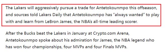 北京时间2月10日,根据美媒LakersDaily的报道,湖人将在休赛期积极寻求交易得到扬尼斯·阿德托昆博。消息人士告知,阿德托昆博一直渴望与NBA历史得分王勒布朗·詹姆斯并肩作战并向他学习。