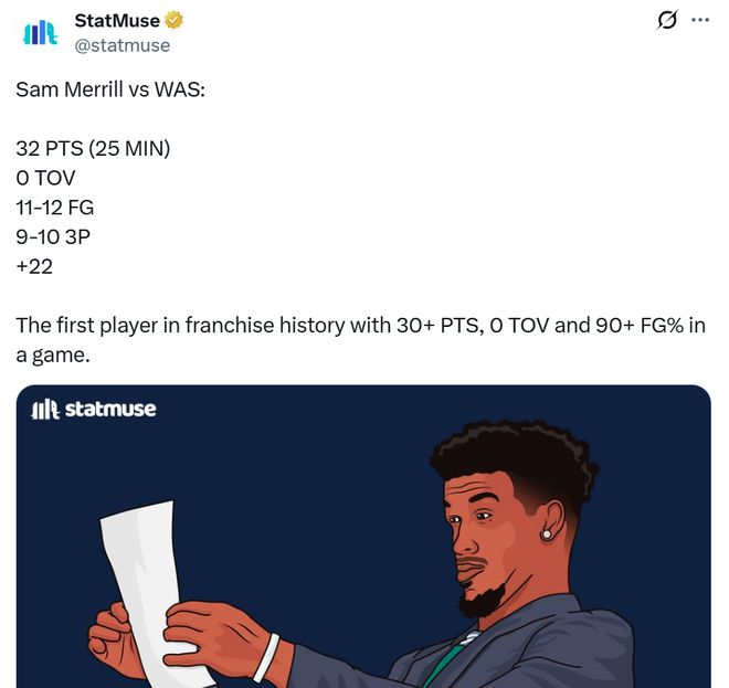 凭借这样的表现,梅里尔成为骑士队史首位以至少90%命中率,砍下30+同时没有出现任何失误的球员。