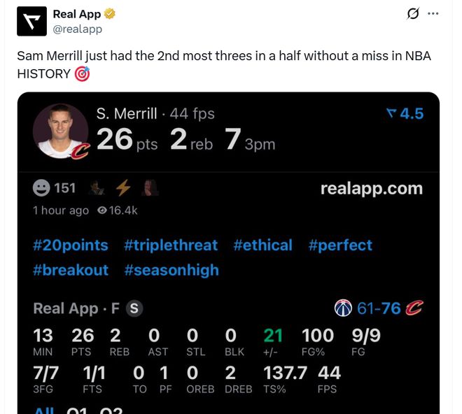 并且半场比赛梅里尔三分7中7也打破NBA历史纪录,并列NBA历史第二多,仅次于布伦森(8记)。