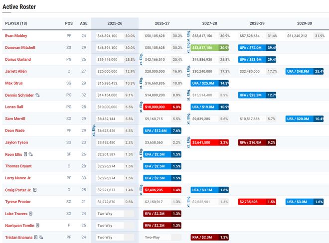 所以骑士队本赛季更多的运作都还是为节省开支为主,加兰、阿伦、米切尔、莫布利四位拿着亿元合同的球员占据了球队大部分的薪金空间,这四人可能只有米切尔、莫布利要安全一点。