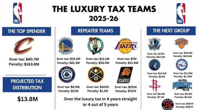 在这笔交易之前,骑士队是联盟超税额度、奢侈税罚款最多的球队,超税额度4070万,奢侈税重罚高达1.63亿美元,但这笔交易后骑士队本赛季的薪资与奢侈税罚款合计降低5000万美元左右。