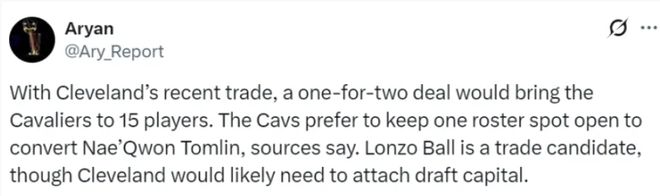 根据美记Aryan的说法,因为交易达成后骑士就是15人大名单,骑士倾向于将内匡的双向合同转正所以球队还需要腾出一个空位,朗佐鲍尔就是交易对象之一,不过骑士要送走他可能要送出选秀权。