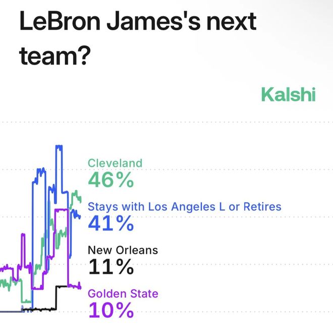 根据数据媒体Kalshi Sports对詹姆斯今夏的下家概率,骑士队46%第一,留湖人/退役41%第二,换言之骑士队在本赛季清理了薪金空间后今夏有希望签回41岁的勒布朗-詹姆斯。