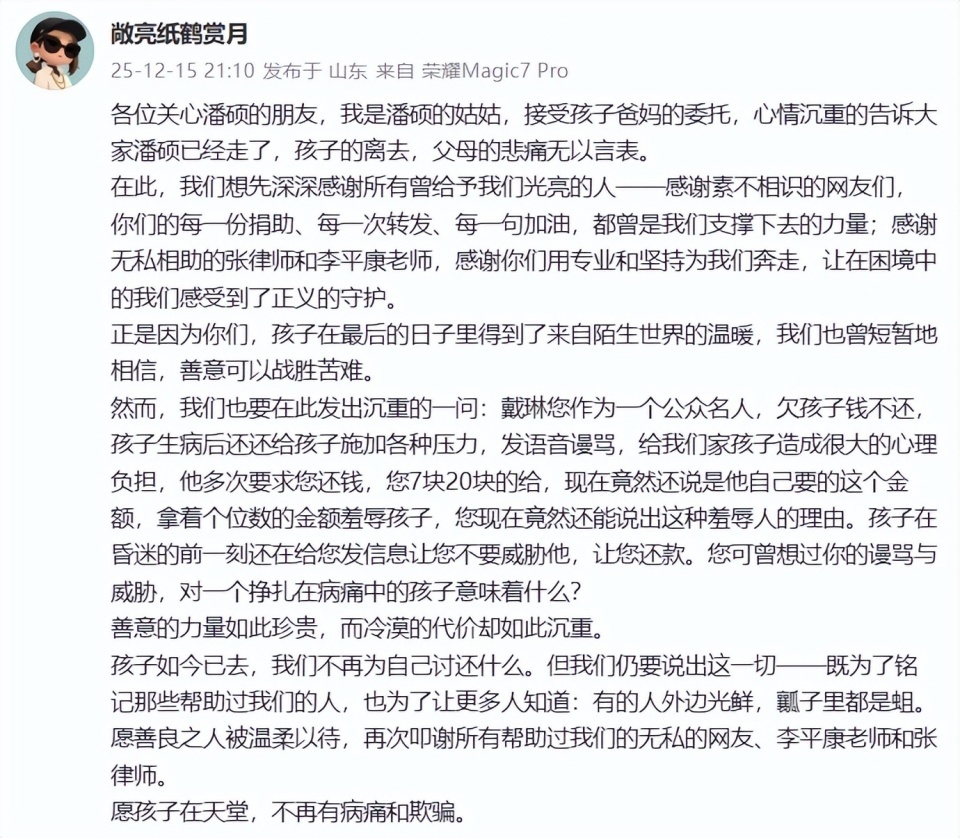 首先要明确核心结论:戴琳绝非仅需承受道德批判,其行为已涉及多重法律责任,最明确的便是民间借贷纠纷中的民事违约责任。从已曝光的细节来看,戴琳出具了7万元的签字欠条,与小潘形成了合法的民间借贷关系,这一点有完整证据链支撑。根据《最高人民法院关于审理民间借贷案件适用法律若干问题的规定》,戴琳未按约定足额偿还欠款,本身就违反了民事合同义务。更恶劣的是,这笔欠款并非普通债务,而是小潘的“救命钱”,他在小潘确诊慢加急性肝衰竭、急需巨额医疗费的情况下,仍拖延还款,仅零星偿还3.4万余元,最低一笔还款甚至仅7元,这种消极履约行为已构成严重违约。