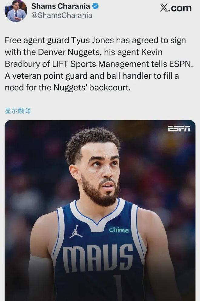 爆料王Shams:泰厄斯-琼斯已经同意加盟掘金。紧接着掘金队记Durando对此表示,琼斯与掘金达成的是一份底薪合同,双方签约至本赛季结束。