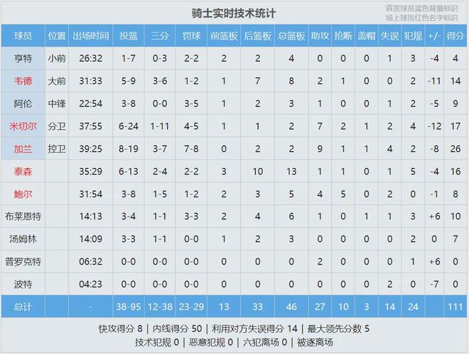 上一场狂轰48分的米切尔,今天彻底迷失了:24投6中,三分11中1,罚球5中4,拿到17分2篮板7助攻2抢断1盖帽,正负值-12全场最低。骑士前锋亨特7投1中仅拿到4分4篮板,加时赛被弃用。骑士中锋阿伦8投3中,拿到9分3篮板。