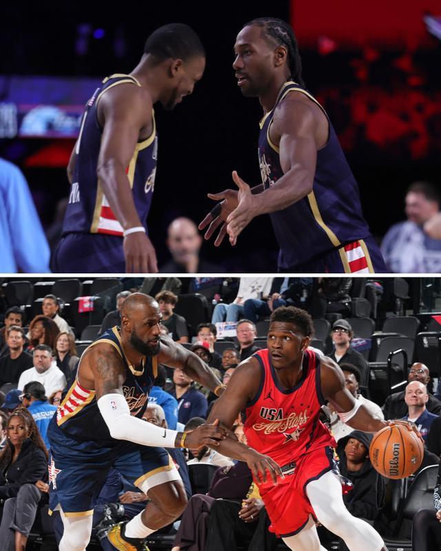 有了第一场比赛的基调,第二场的美国内战同样一上来就格外激烈。曾经放话美国老同志会努力应战的杜兰特开场就投进三分,杰伦·布朗更是火力全开频繁冲击,老同志组成的条纹队一度领先到8分。
