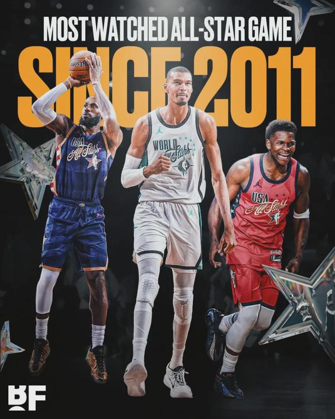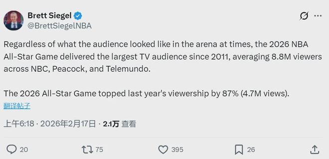 北京时间2月17日,据NBA记者Brett Siegel报道,2026年NBA全明星正赛收视人数公布:在NBC、Peacock和Telemundo三大平台平均观众人数达到880万,创下自2011年以来,近15年全明星正赛的最高收视纪录,比2025年(470万)暴涨了87%。