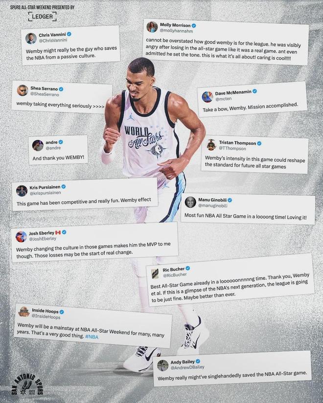 NBA专栏作者Jared Weiss写道:“文班亚马曾誓言,要让全明星正赛重回昔日荣光。今年,他向篮球世界兑现了自己的承诺。这场比赛的表现,进一步巩固了文班亚马作为NBA下一位门面的地位。”文班打了两节,13投10中砍下33分8篮板3盖帽。