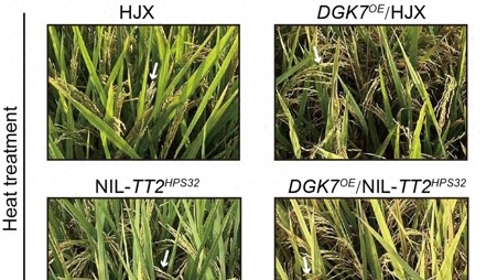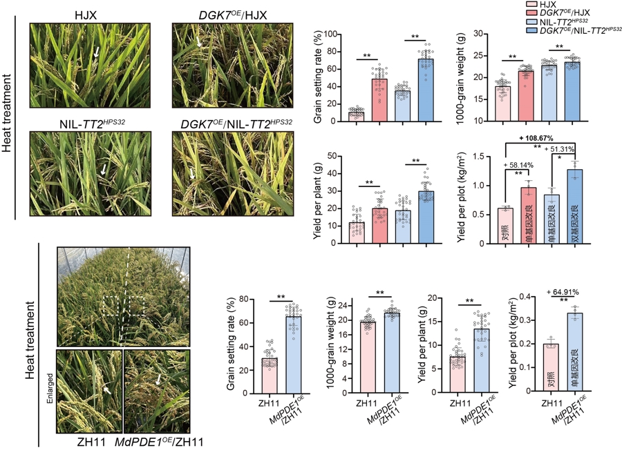 “双重密码”的破解为育种提供了精准靶点。科研团队基于DGK7和MdPDE1开展遗传设计,在模拟高温的田间试验中取得了令人欣喜的收获:单基因改良的水稻株系比对照株系增产50%—60%;TT2协同DGK7的双基因改良株系比对照株系产量提升约一倍,米质也比对照株系好,且不影响正常条件下的产量。