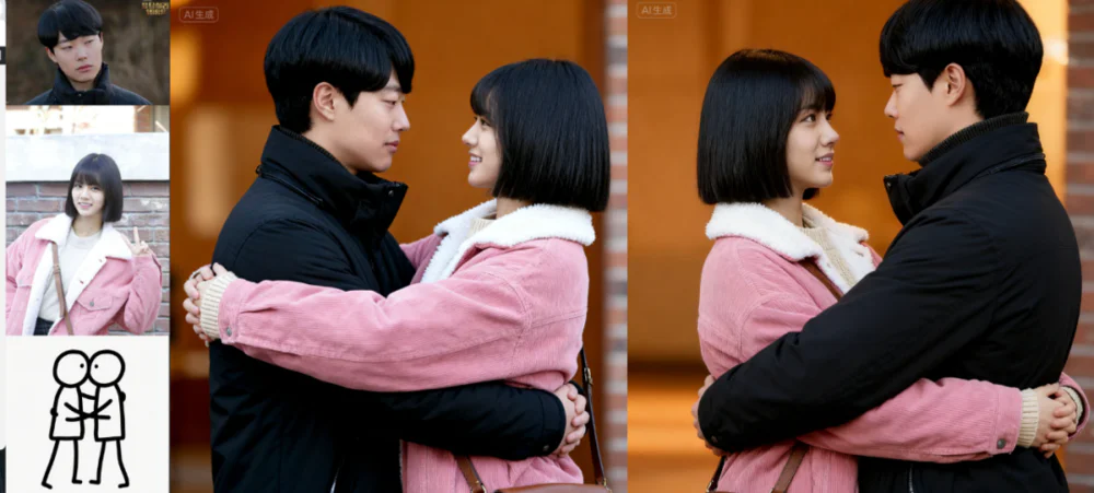 提示词:将图1男子和图2女子合进一张画面,参考图3姿势