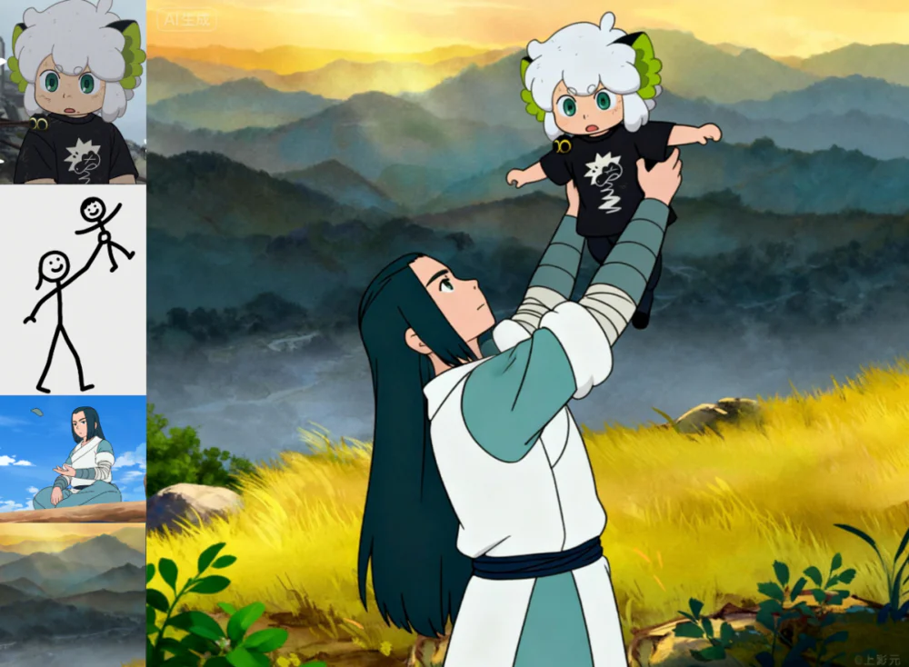 提示词:将图3和图1合进一张画面,参考图2姿势,图1是被举起来的那个小孩;同时背景使用图4。图四的背景是来自浪浪山,两个角色是罗小黑和他的师傅。