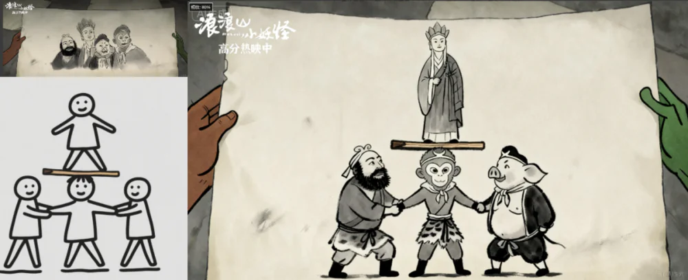 提示词:把图一的四个角色(西游记里面的师徒四人,沙僧、唐僧、猪八戒、孙悟空)按照图二的姿势(叠罗汉)排布,沙僧、孙悟空和猪八戒在下面,唐僧在上面。