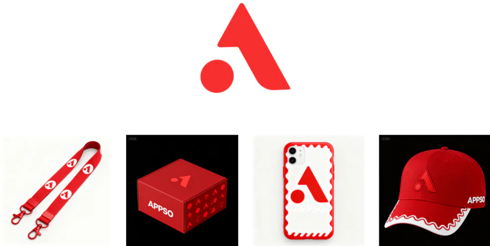提示词:参考这个LOGO,做一套品牌视觉设计,品牌名称为 APPSO,包括包装袋、帽子、纸盒、卡片、手环、挂绳等。红色视觉主色调,趣味、简约现代风格