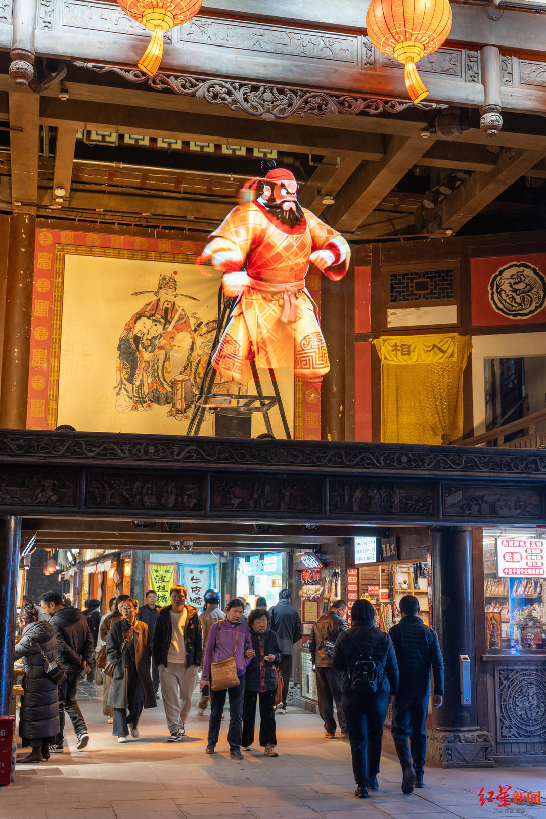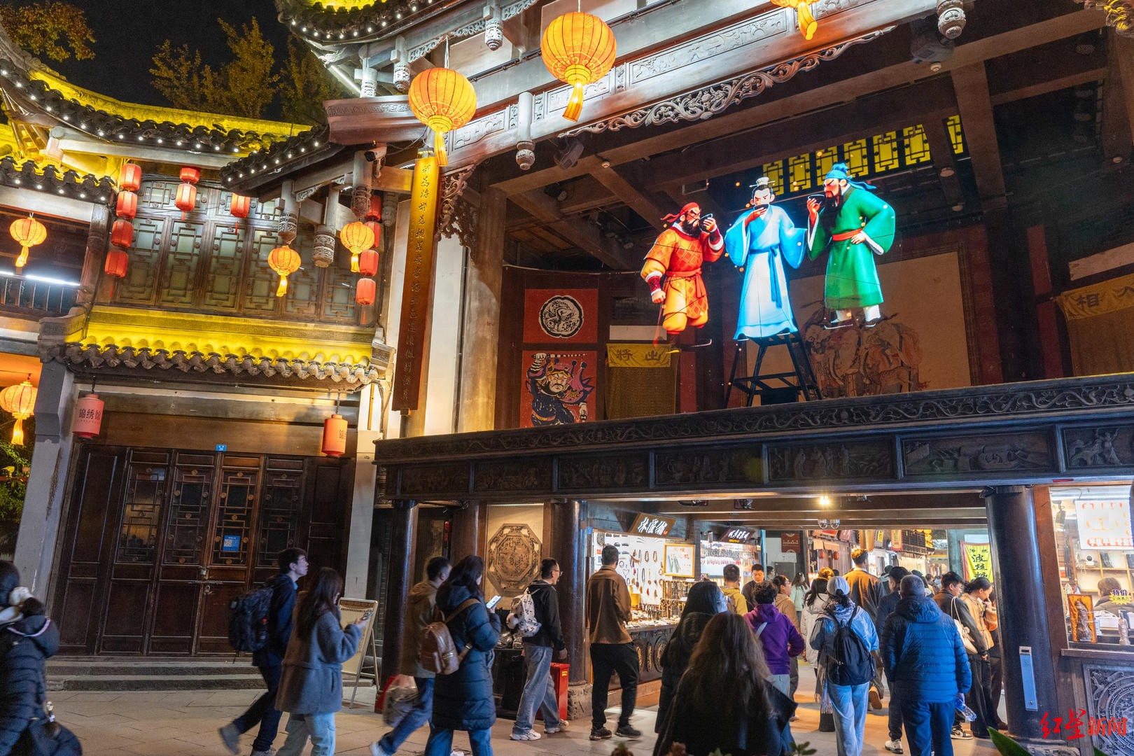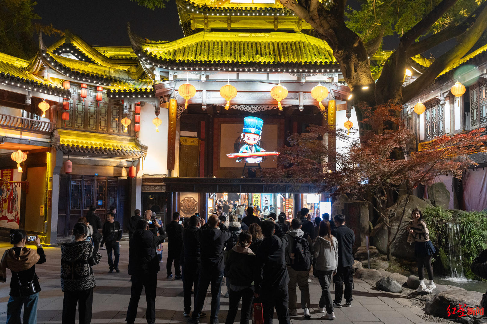 古街古韵,树影摇曳。华灯初上之时,锦里古街转角处,原本稍显“沉默”的古戏台突然像是被“注入了灵魂”——木质结构的二层戏楼上,光影成像,刘关张举杯结拜成兄弟,诸葛亮抚琴唱起了空城计。