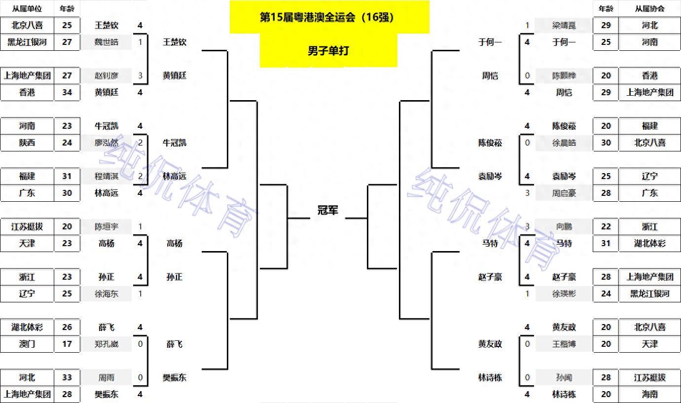 4号种子樊振东(上海)4-0完胜周雨(河北);8号种子林高远(广东)4-2战胜程靖淇(福建);9号种子黄镇廷(香港)4-3战胜赵钊彦(上海);10号种子陈俊菘(福建)4-0完胜徐晨皓(北京)。