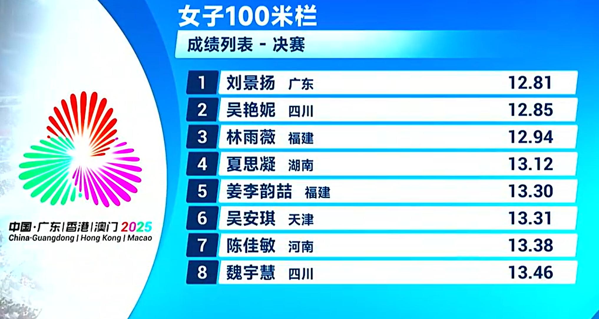 11月19日晚间,2025年第十五届全运会田径项目的多项决赛在广东省奥体中心体育场举行。在压轴进行的女子100米栏决赛中,广东队刘景扬最后时刻完成反超,以12秒81获得冠军并刷新个人最好成绩,四川队名将吴艳妮以12秒85获得亚军,福建队的林雨薇以12秒94获得季军。