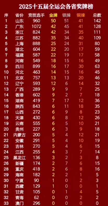 目前已经有4支队伍的奖牌总数超过100了,分别是山东142,广东128,浙江111,江苏109,金牌山东目前已经甩开广东和浙江,不出意外能够收获最终的金牌榜第一,那将连续五届斩获榜首,延续强大的实力。